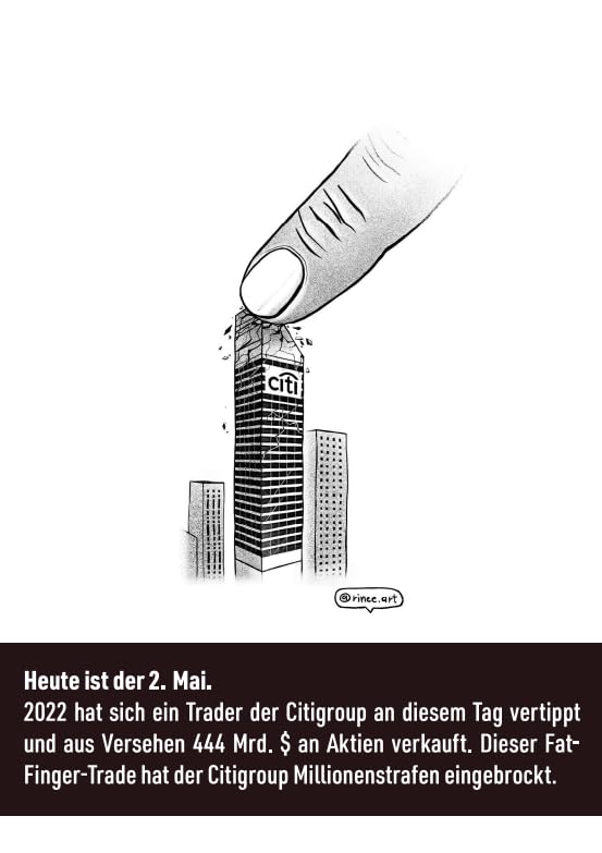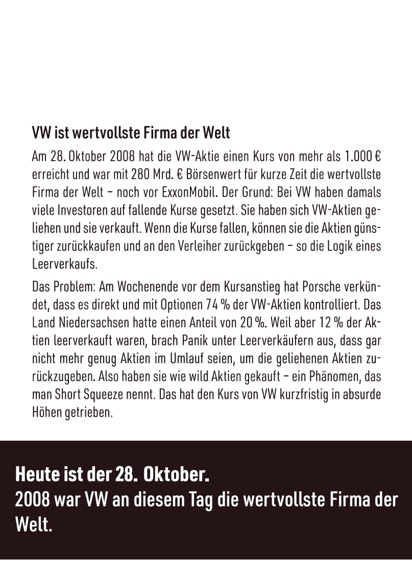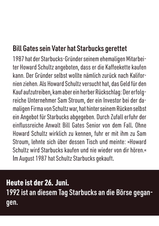 Steve Jobs wurde nicht durch Apple zum Milliardär. Bernard Arnault hielt Gucci für wertlos. U.S. Steel war die erste Firma mit mehr als 1 Mrd. $ Börsenwert. Geschichte wiederholt sich nicht, aber sie reimt sich. Das gilt vor allem an der Börse. Von den Krisen, Hype-Phasen, Gründungsgeschichten und Ereignissen der Vergangenheit kann man extrem viel lernen. Neben vielen spannenden Anekdoten bietet dieser Kalender Börsenweisheiten, Fakten und interessante Geschäftsmodelle. Dazu gibt es immer wieder Empfehlungen zu Tools, Quellen und Medien, die die Recherche rund um Aktien erleichtern sowie Illustrationen, die den Börsenalltag auflockern.